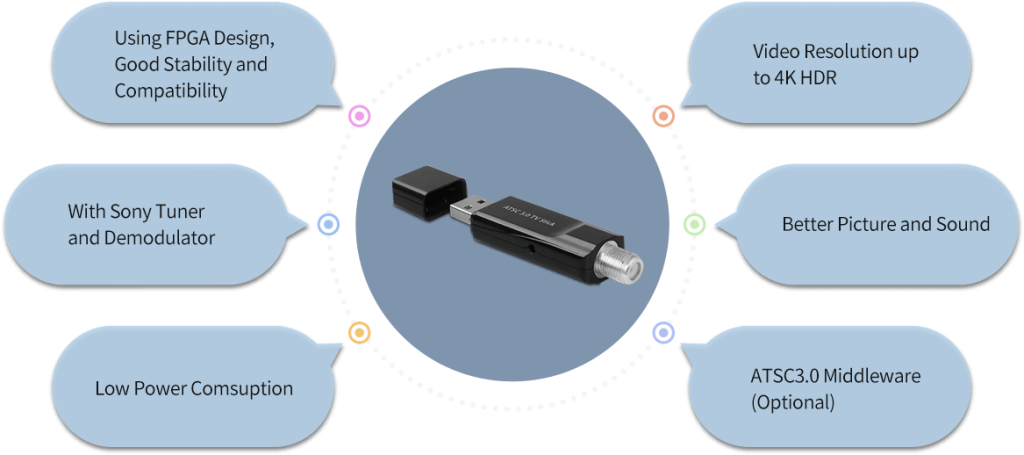 It can be connected to the Android OTT Box/PC /Smart Phone/Tablet to realize watch ATSC 1.0/3.0 live TV programes.