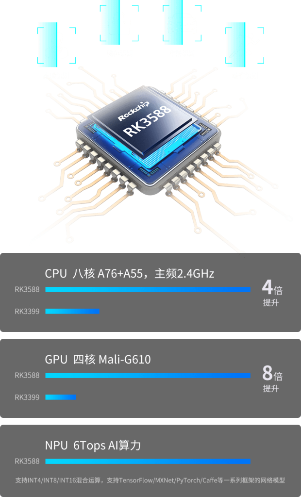 8nm先进制程,集成ARM Mali-G610 MP4四核GPU,支持8K超清视频解码,内置6TOPs AI NPU,支持主流的深度学习框架,可为各类AI应用场景带来更优异的性能表现。