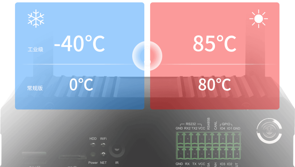 采用超强固轻型铝合金材质,一体化无风扇结构散热设计,可在-40~85°C环境下7×24小时稳定运行,适用各类严苛的工业使用环境。