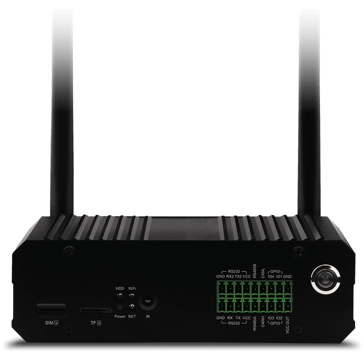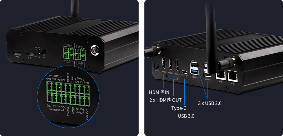 | I/O | USB3.0 x 1/USB2.0 x 3/HDMI OUT x 2/HDMI IN x 1/SIM Card Slot/TF Slot/RS-232 x 2/RS-485/CAN/GPIO x 4/IR IN |