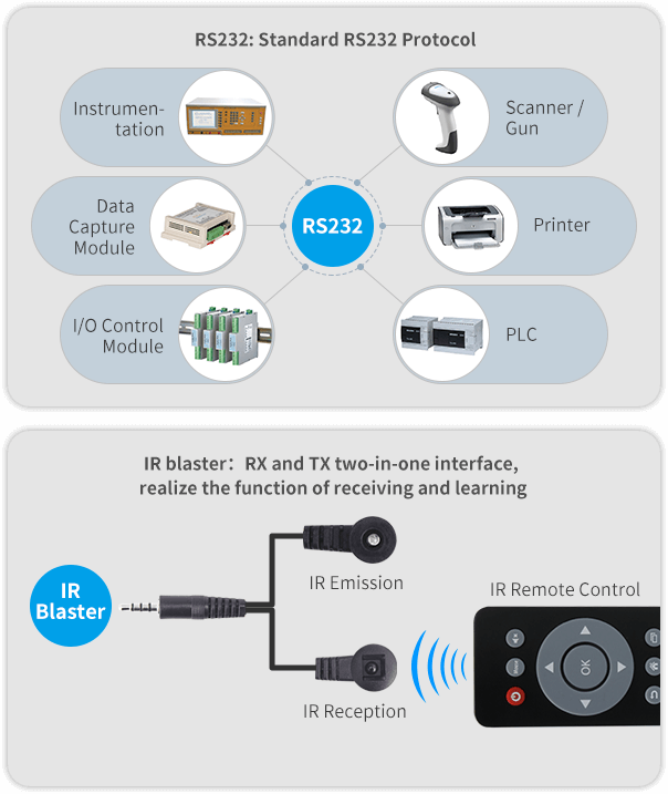 | IR blaster | 1 * 3.5mm headphone jack (Choose one of two, default RS232) | ||||