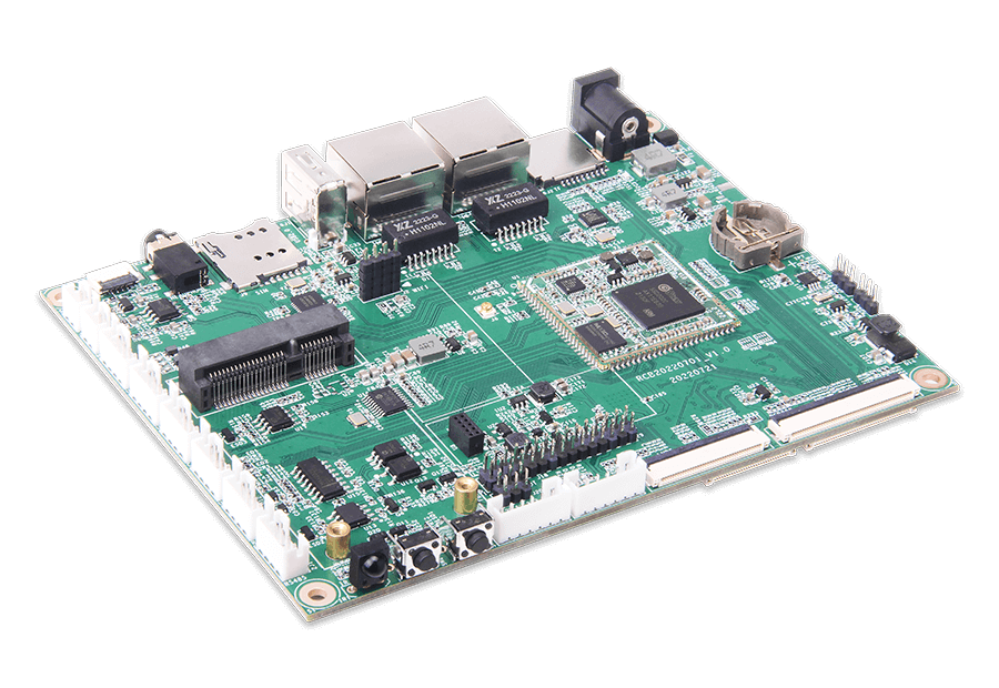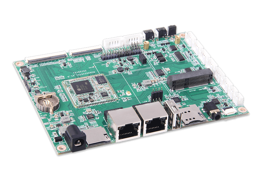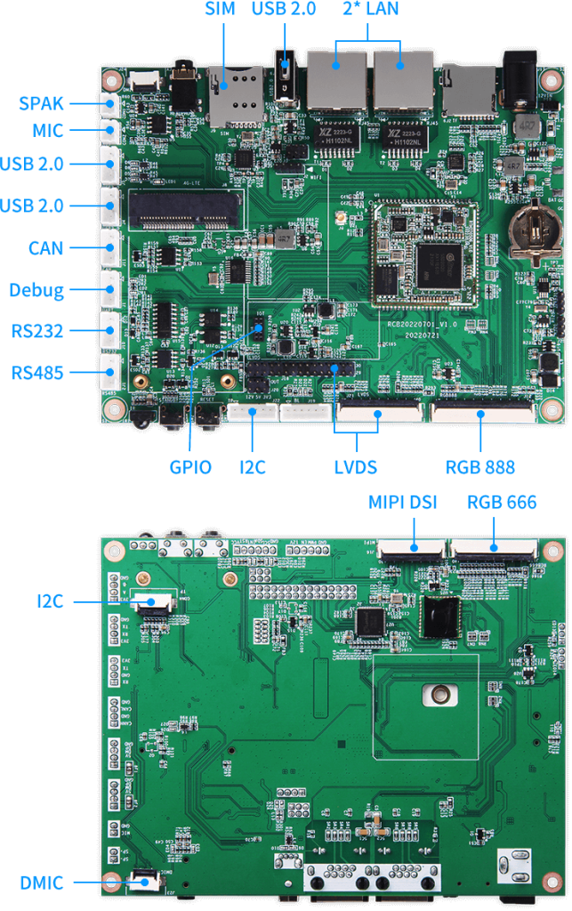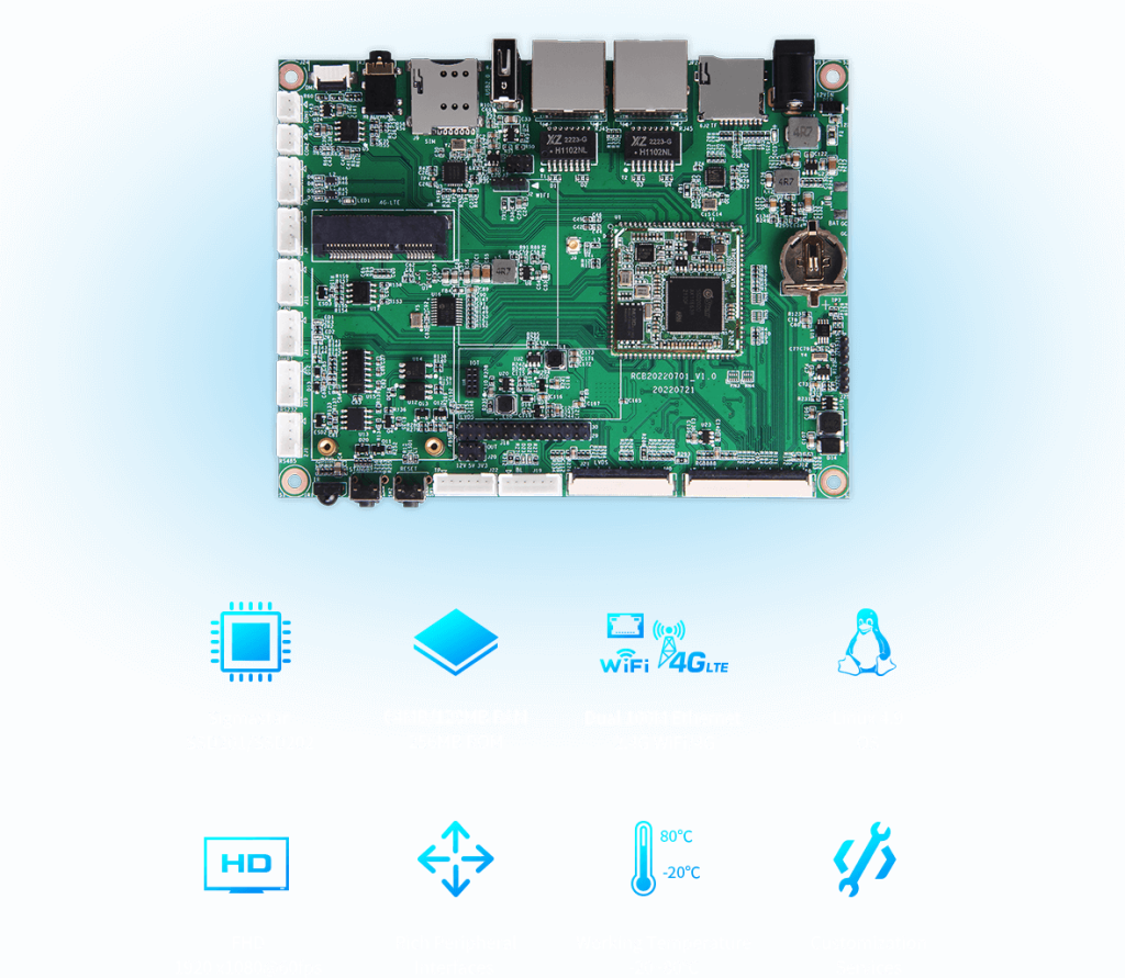 Equipped with UART, I2C, GPIO, USB2.0, MIPI DSI, RGB, LVDS, I2S, RGMII, RS232, RS485, CAN, audio input and output and other rich expansion interfaces, supporting dual 100M Ethernet, 2.4G Wi-Fi and 4G mobile communication, providing rich functional expansion for product applications.