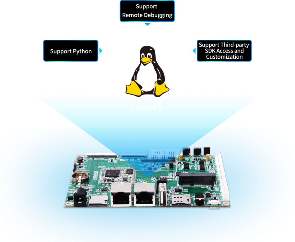 Embedded linux 4.9 operating system, very fast boot-up speed, support Phthon, remote debugging, support third-party SDK access and customization, can provide a complete set of software system customization services including system kernel modification, driver transplantation, application development and UI interface customization, etc., to provide a safe and stable system environment for product development and production.