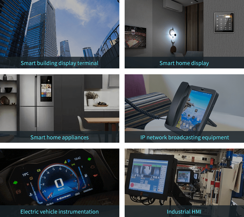 It is widely used in smart building display terminal, smart home display, smart home appliances, IP network broadcasting equipment, electric vehicle instrumentation, industrial IoT gateway, industrial HMI and other various application scenarios with low performance requirements but harsh cost requirements.