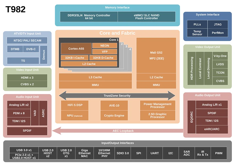 Amlogic T982 is a high-performance, highly integrated, low-power AI smart processor with advanced 12nm FINFET process, built-in 2.6Tops NPU, support for Caffe/TensorFlow and other mainstream deep learning framework models, and its own tensor processing unit (TPU) architecture neural network gas pedal (NNA), which can bring better performance for various AI The NNA with tensor processing unit (TPU) architecture can bring better performance for various AI application scenarios.