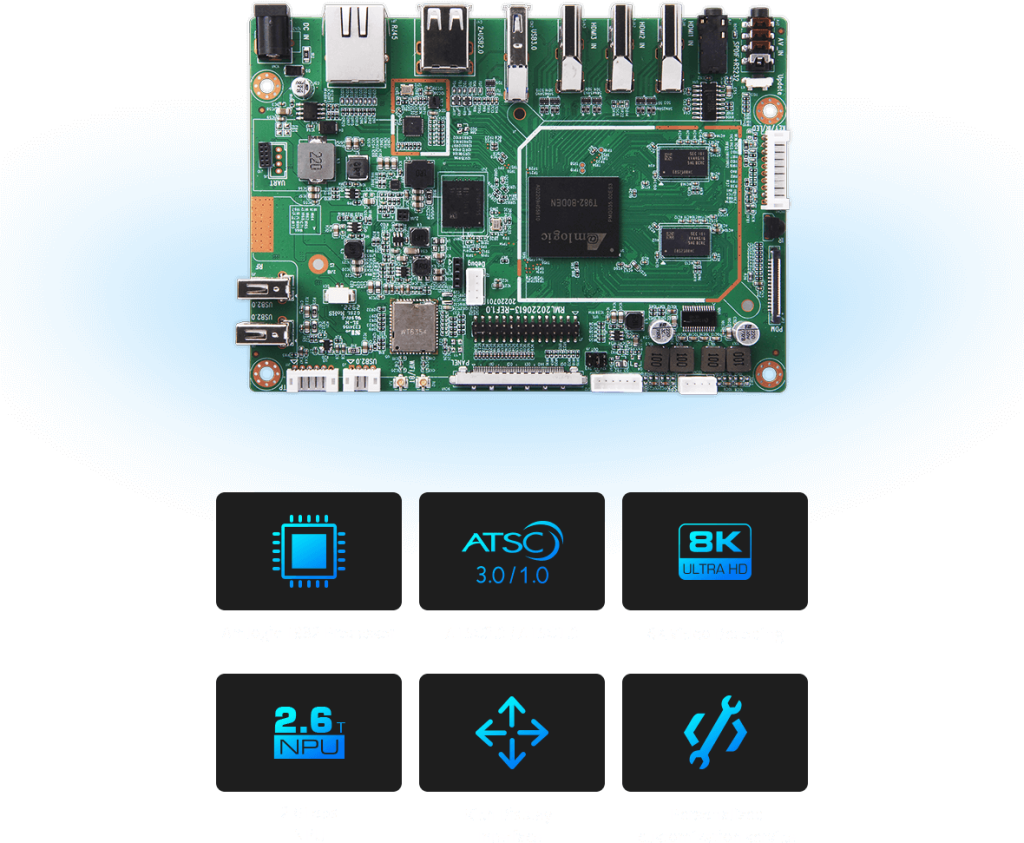 DB982 Smart TV motherboard adopts Amlogic T982 super performance AI processor, features Android 11.0 OS, and supports single/dual ATSC3.0/ATSC1.0 Tuner, integrated mainstream LVDS and ultra-high-definition VX1 LCD screen interface, three-way 4KP60 HDMI® IN input and one AV input interface, reserves GTIOT One-stop service for a variety of network communication modes, enriching functions and meeting the needs of more developers in different scenarios.