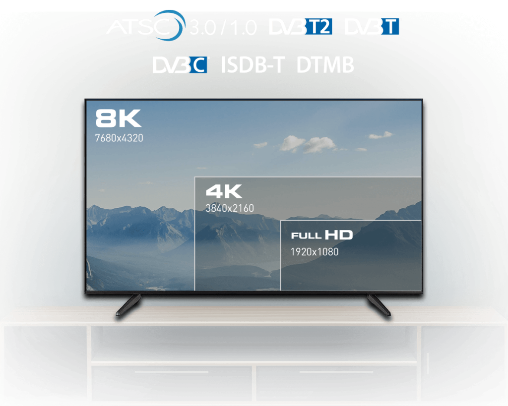 Deeply build modular single/dual ATSC3.0/ATSC1.0 and flexible combination in ATSC3.0, ATSC1.0, DVB-T2, DVB-T, DVB-C, ISDB-T, DTMB standard. Support AV1/VP9 8K@30fps, 4K@60fps and other HD video hard decoding, support Dolby Vision Optional, HDR10/10+, HLG, MS-12(AC4).