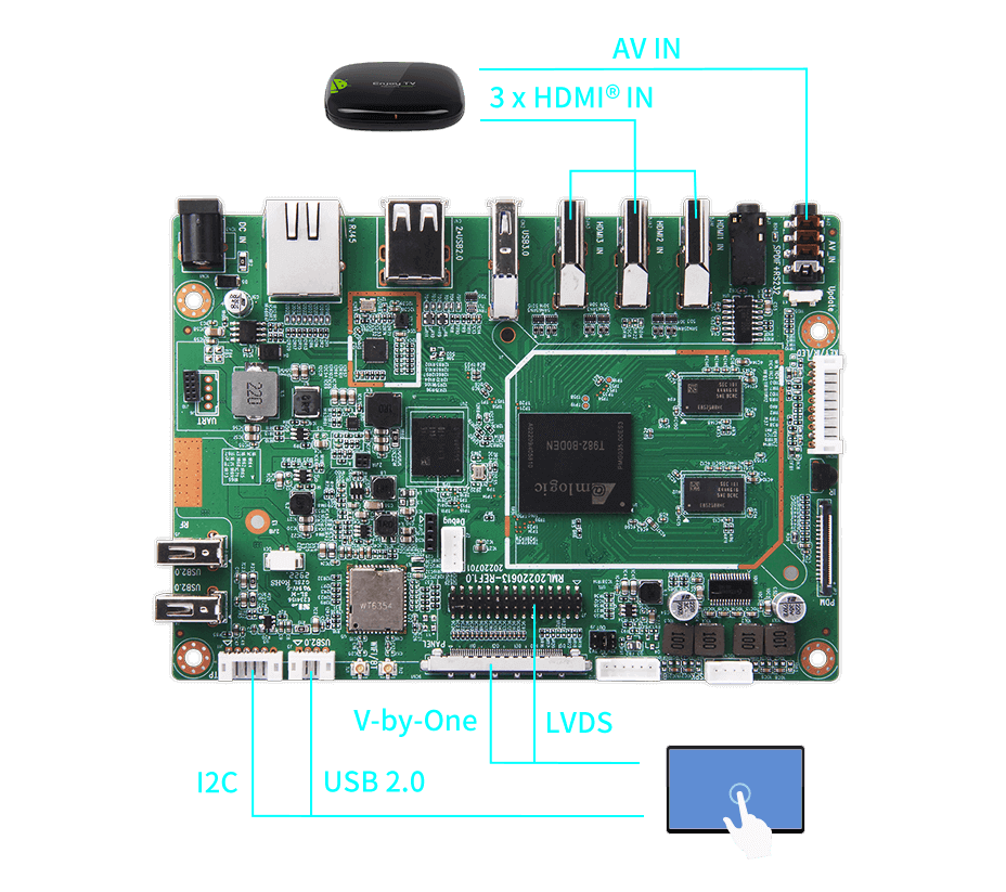 It supports V-by-One and LVDS display output, 3 HDMI® and 1 AV display input, and also adds touch screen interface, which is compatible with 10.1~65 inch screen and supports rotation and picture-in-picture display, bringing a new experience of smarter and more interesting.