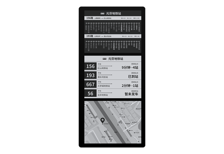 Geniatech BSS1330 is a 13.3″ e-paper bus stop solution featuring a “one-to-three” display design, capable of simultaneously displaying real-time information for three screens, such as next departure, service alerts, maps and custom messages. Built with reflective e-paper technology and low-power architecture, it ensures energy efficiency, wide-temperature adaptability, and simplified management for transport systems.