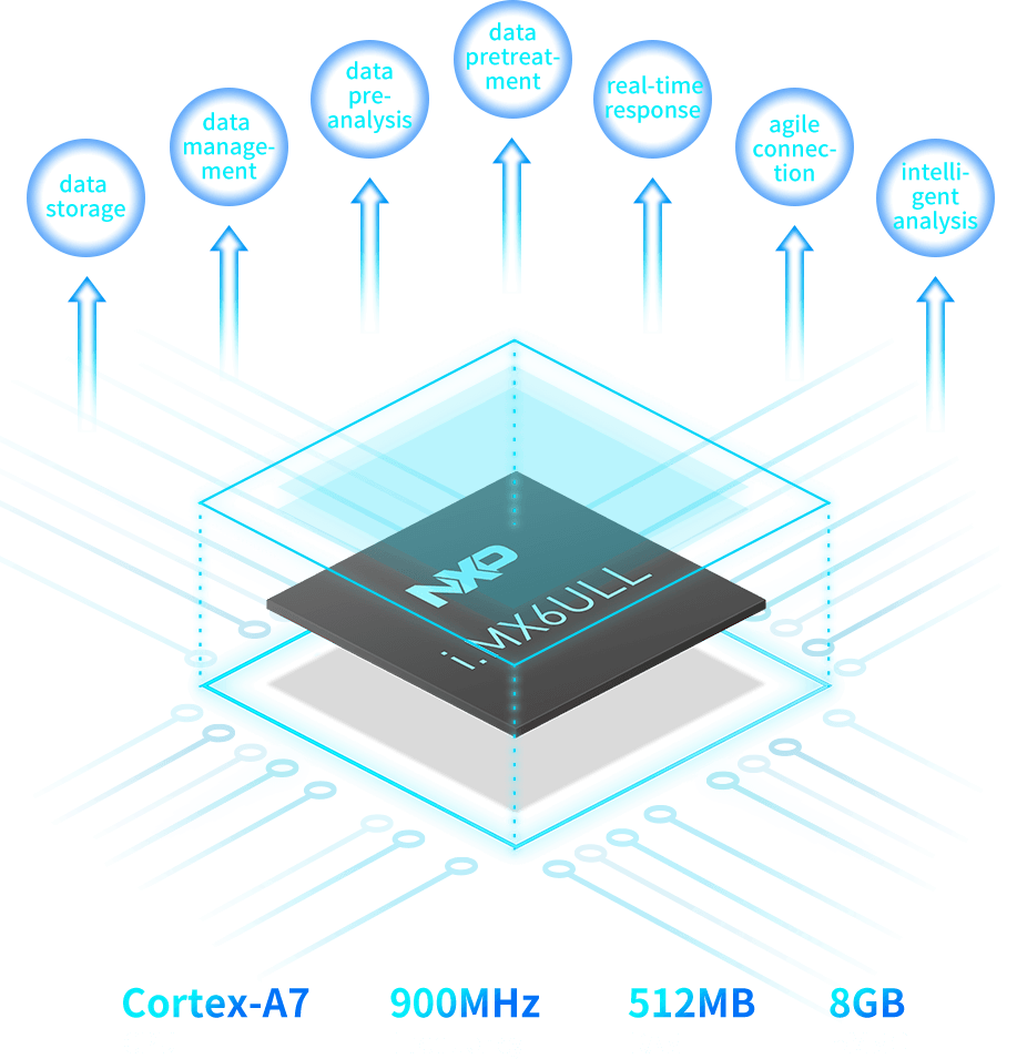 ARM Cortex-A7 processor, up to 900MHz main frequency, 512MB RAM, 8GB eMMC storage, for realizing the powerful performance resources for the field equipment data storage, data management, data pre-analysis, real-time response, agile connection, intelligent analysis.