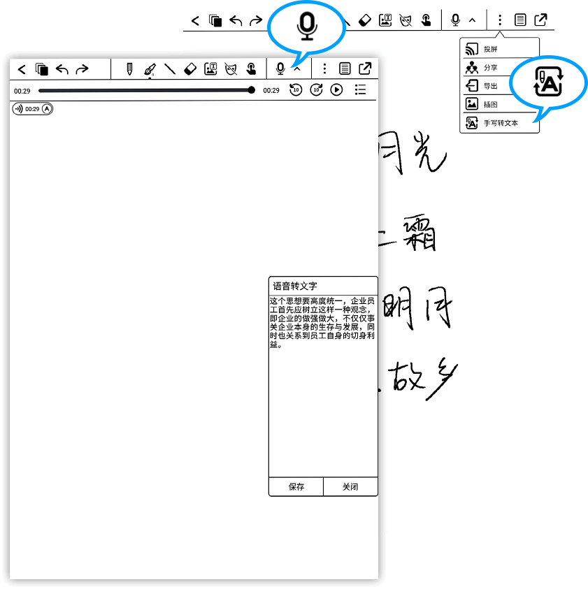 笔记时支持同步录音,录音一键转录为文字,亦可将书写文字转录为文本,并可对转录后的文本编辑保存,