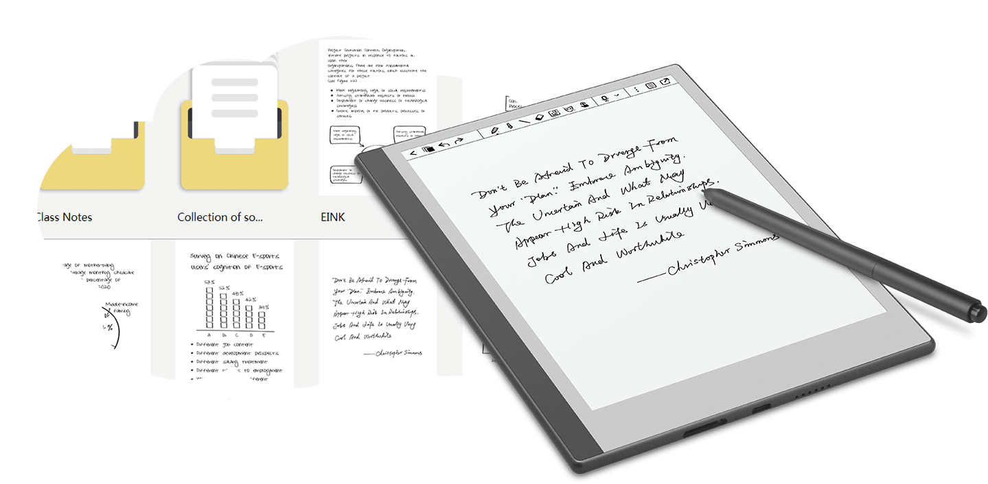 类纸笔般的阅读、书写体验,无频闪,无惧强光,长时间使用有效呵护双眼,预置多套笔记模板,记录更加得心应手,
