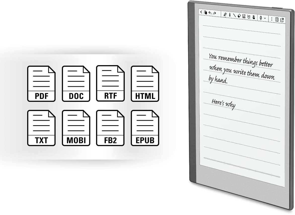 支持PDF、DOC、RTF、TXT、FB2等十几种电子书文件格式,可通过WiFi、蓝牙、USB等方式传输到电纸书内,