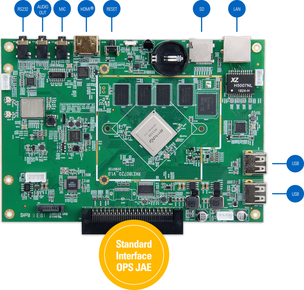 Geniatech OPS3399是一款基于瑞芯微RK3399处理器的OPS(开放可插拔规范)开发板,搭载四核Cortex-A72/A53 @1.8GHz CPU。运行Android 10系统,可无缝集成至显示设备实现嵌入式计算应用。配备2GB LPDDR4内存、8GB eMMC存储、Wi-Fi、LAN、USB接口及SD/TF扩展槽,支持程序播放功能,并可通过壁挂支架或桌面支架实现灵活安装,是零售场景与交互式通信解决方案的理想之选。