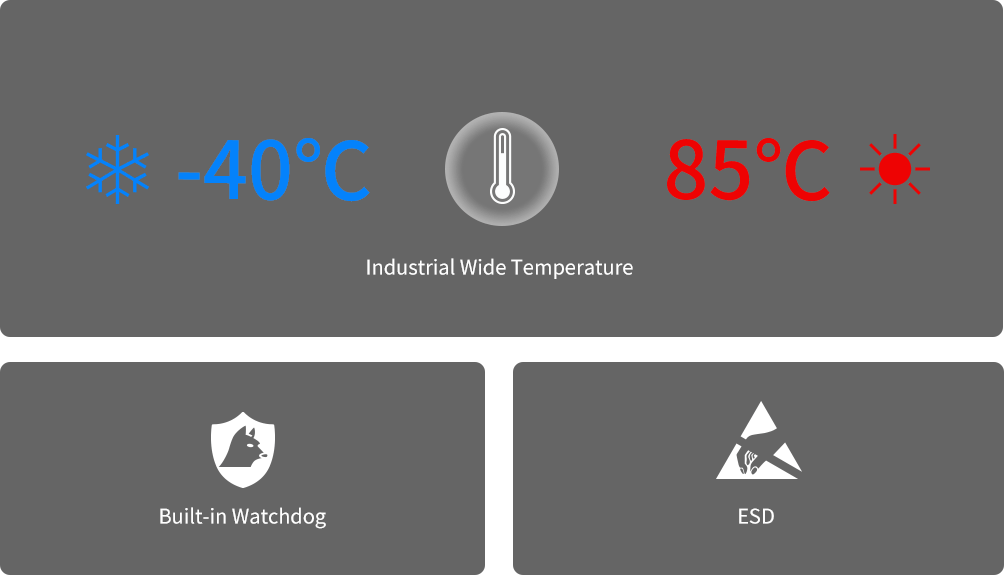 All components are designed with industrial wide temperature -40~85℃, built-in watchdog, ESD electrostatic protection, tested and produced in strict accordance with industrial standards, guaranteeing uninterrupted and stable operation for 7×24 hours in harsh outdoor environments, and meeting the high quality and reliability requirements of industrial applications.