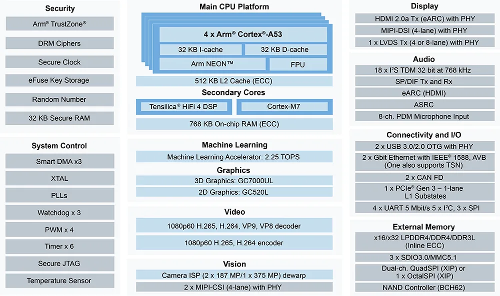 - Multiple display/camera: HDMI 2.0, LVDS, MIPI-CSI/DSI