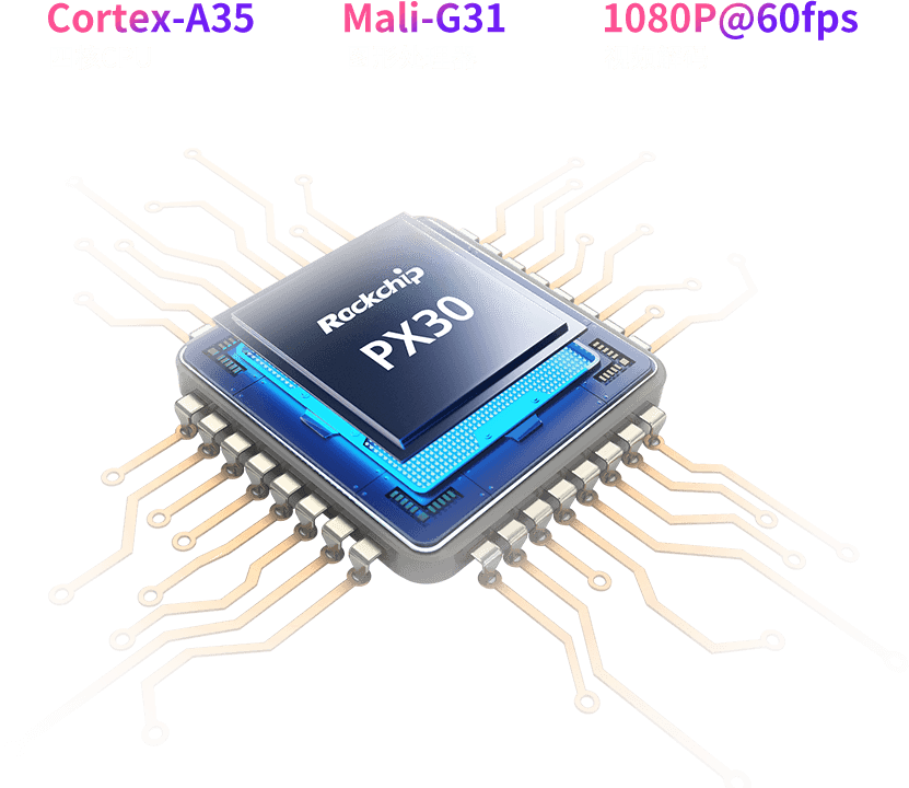 采用PX30工业级64位低功耗处理器,四核Core-A35,集成ARM Mali-G31 MP2 GPU,拥有强大的硬解码能力,可为各类行业及工业应用场景带来更优异的性能表现,赋予产品更多的想象空间。