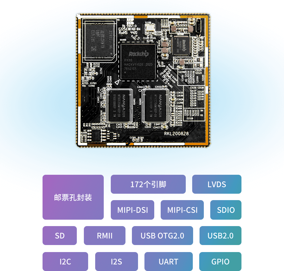 采用邮票孔封装,拥有172个引脚,支持LVDS、MIPI-DSI、MIPI-CSI、SDIO、SD、RMII、USB OTG2.0、USB2.0、I2C、I2S、UART、GPIO等丰富扩展接口,为不同的行业应用提供丰富的外设连接,让项目开发和评估更简单。
