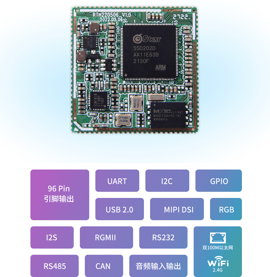 96 Pin引脚输出,支持UART、I2C、GPIO、USB2.0、MIPI DSI、RGB、I2S、RGMII、RS232、RS485、CAN、音频输入输出等丰富扩展接口,支持双100M以太网、2.4G Wi-Fi,为产品应用提供丰富的功能扩展。