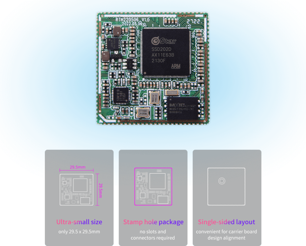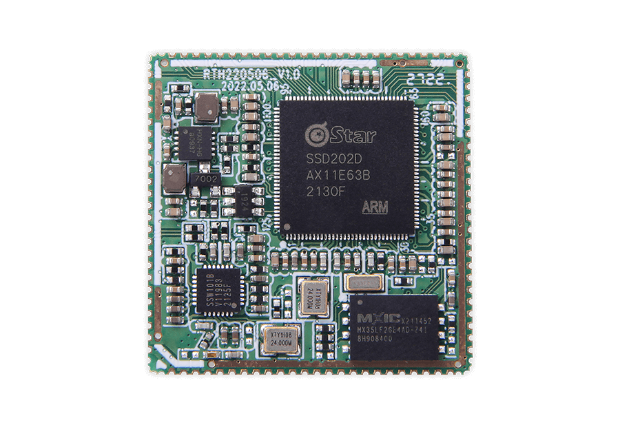 SoM20X core board adopts Sigmastar SSD201/SSD202 SoC, size is only 29.5x 29.5mm, built-in Neon and FPU, integrated H2.64/AVC、H.265/HEVC decoder, core board built-in memory, Wi-Fi, flash, PHY, display output and power circuit, Widely used in intelligent building display terminal, smart home appliances, smart home display screen, VOIP-SIP phone, electric vehicle instrument, industrial Internet of Things gateway, industrial HMI and other application scenarios.
