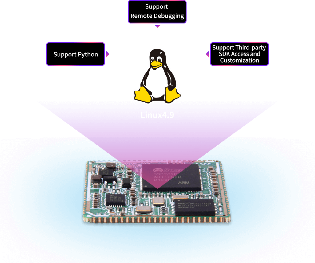 Custom-built embedded linux4.9 operating system, which can boot up very fast, support Phthon, remote debugging,support for third-party SDK access and customization,can provide complete set of software system customization services, including system kernel modification, driver migration, application development and UI interface customization, thus providing a safe and stable system environment for product research and production.