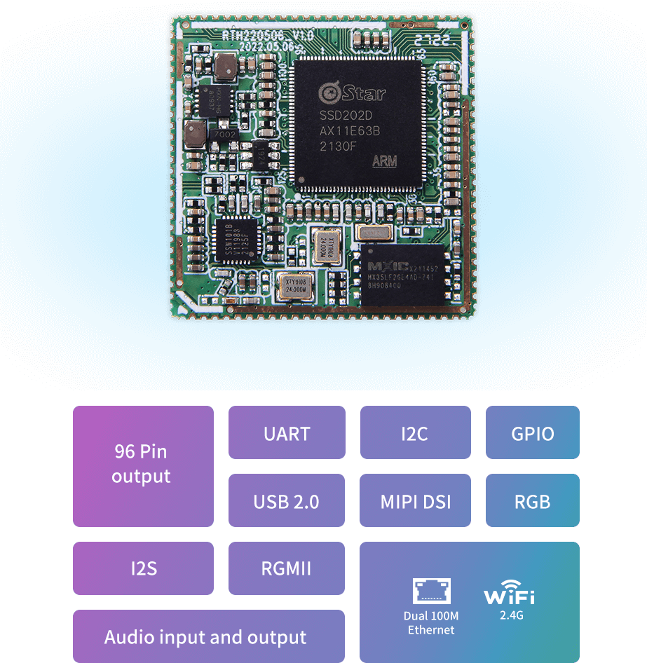 96 Pin output, support UART, I2C, GPIO, USB2.0, MIPI DSI, RGB, I2S, RGMII, audio input and output and other rich expansion interface, support double 100M Ethernet, 2.4G Wi-Fi, Provides rich function expansion for product applications.