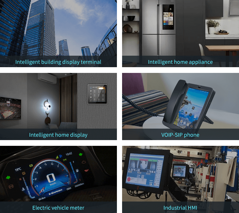 Widely used in intelligent building display terminal, smart home appliances, smart home display screen, VOIP-SIP phone, electric vehicle instrument, industrial Internet of Things gateway, industrial HMI and other application scenarios.