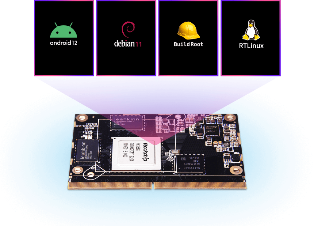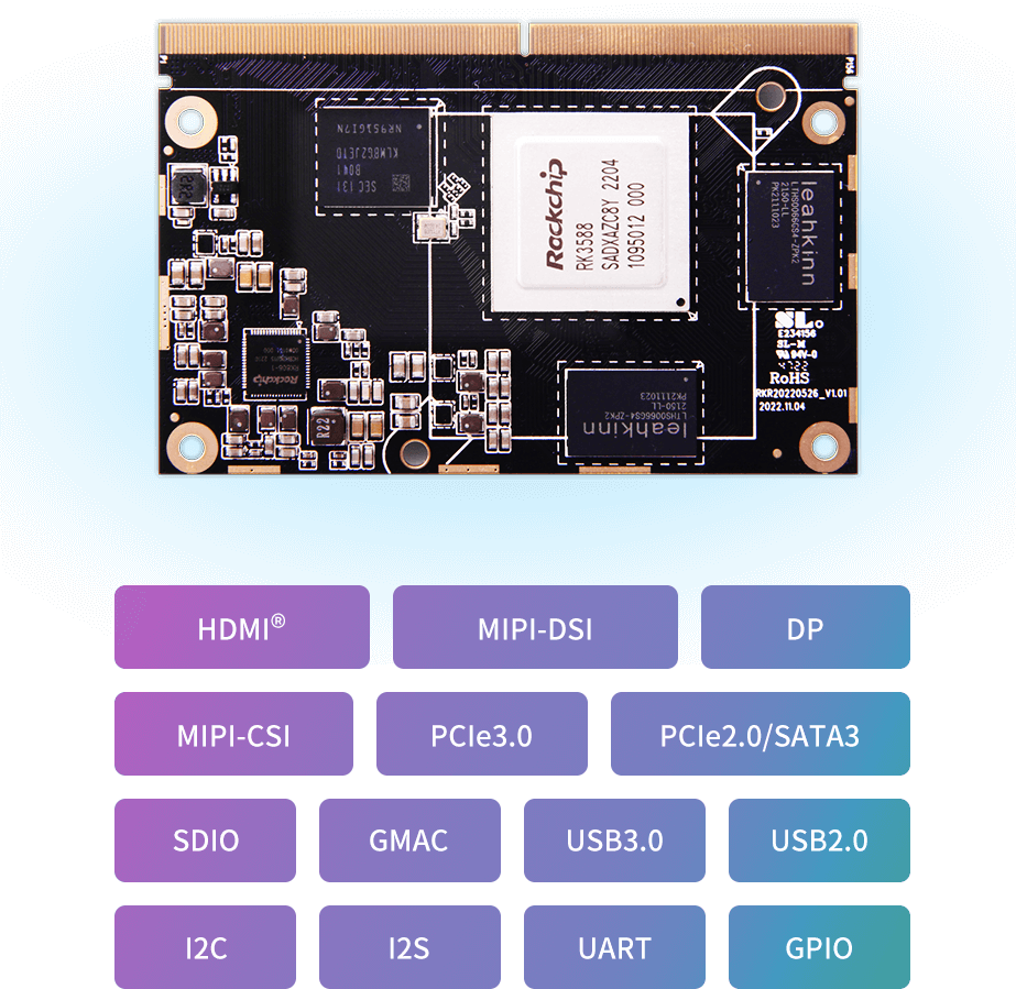 SOM3588采用瑞芯微RK3588旗舰芯片,集成6Tops NPU和高性能四核Mali-G610 MP4 GPU,采用SODIMM314Pin标准接口,可扩展丰富的显示接口和行业应用接口,配合开放的底板设计资料和开源的SDK,可高效进行二次开发。支持Android、Debian、Buildroot、RTLinux等多个操作系统,为各类AI应用场景提供性能强悍、稳定可靠、扩展性强的产品支持,可广泛适用于边缘计算、人工智能、云计算、VR/AR、区块链、智能安防、智能工业控制、智能家居等领域。