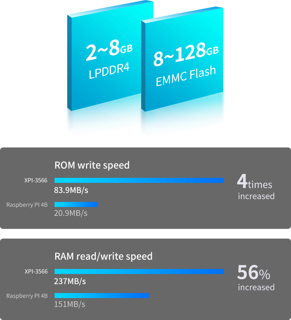 XPI-3566 features support for 2 to 8GB LPDDR4 RAM and 8 to 128GB eMMC on board. In comparison to the Raspberry Pi, which only supports SD card storage, the XPI-3566’s eMMC design provides faster read and write speeds that are up to 4 times faster, and its LPDDR4 RAM read/write speeds are increased by 56%.