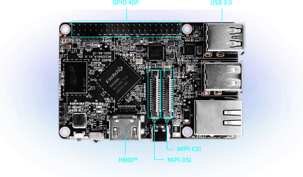 | Interface | 1 x HDMI® out, 1 x MIPI-DSI, 1 x MIPI-CSI 1 x USB HOST 3.0, 1 x USB OTG 3.0, 2 x USB Host 2.0 1 x Standard 40-pin GPIO header UART, IR, Micro SD Slot |